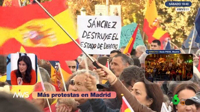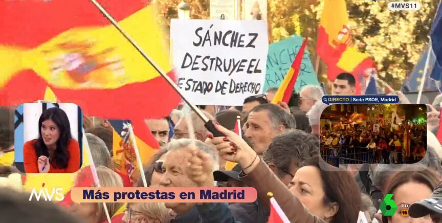 Las protestas contra la amnistía del procès siguen teniendo lugar cada noche frente a la sede del PSOE, en Ferraz. Una situación a la que Pedro Sánchez hizo mención en su discurso de investidura, tal y como recordó María Llapart en Más Vale Sábado: "Gran parte lo dedicó a la inseguridad que hay en las calles y a la actitud de la ultraderecha".