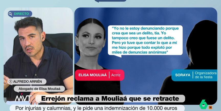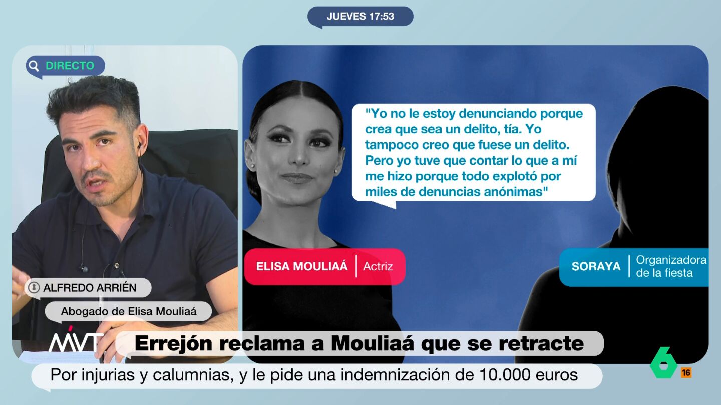 Alfredo Arrién, abogado de Mouliaá, ha restado importancia a las acusaciones de su representada en Más Vale Tarde. "Elisa está en tratamiento, está sufriendo y viviendo una tormenta emocional, es normal que pueda tener algún traspiés a la hora de sentenciar alguna cosa como verdad y no como hipótesis", ha asegurado.