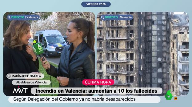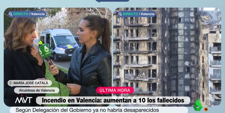 La alcaldesa de Valencia, María José Catalá, ha atendido a Más Vale Tarde tras la tragedia que ha asolado el barrio de Campanar de la ciudad, donde un voraz incendio declarado el jueves se ha cobrado la vida de al menos 10 personas y ha devastado un gran edificio residencial de 14 plantas.