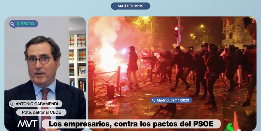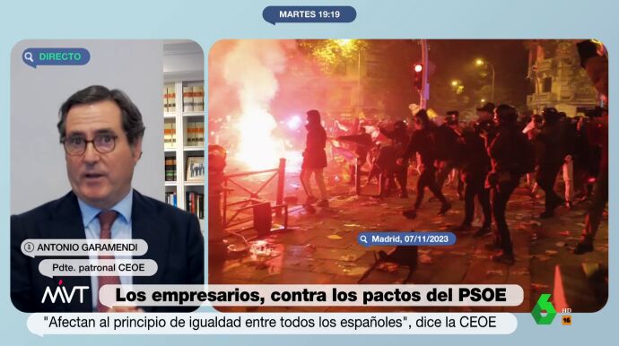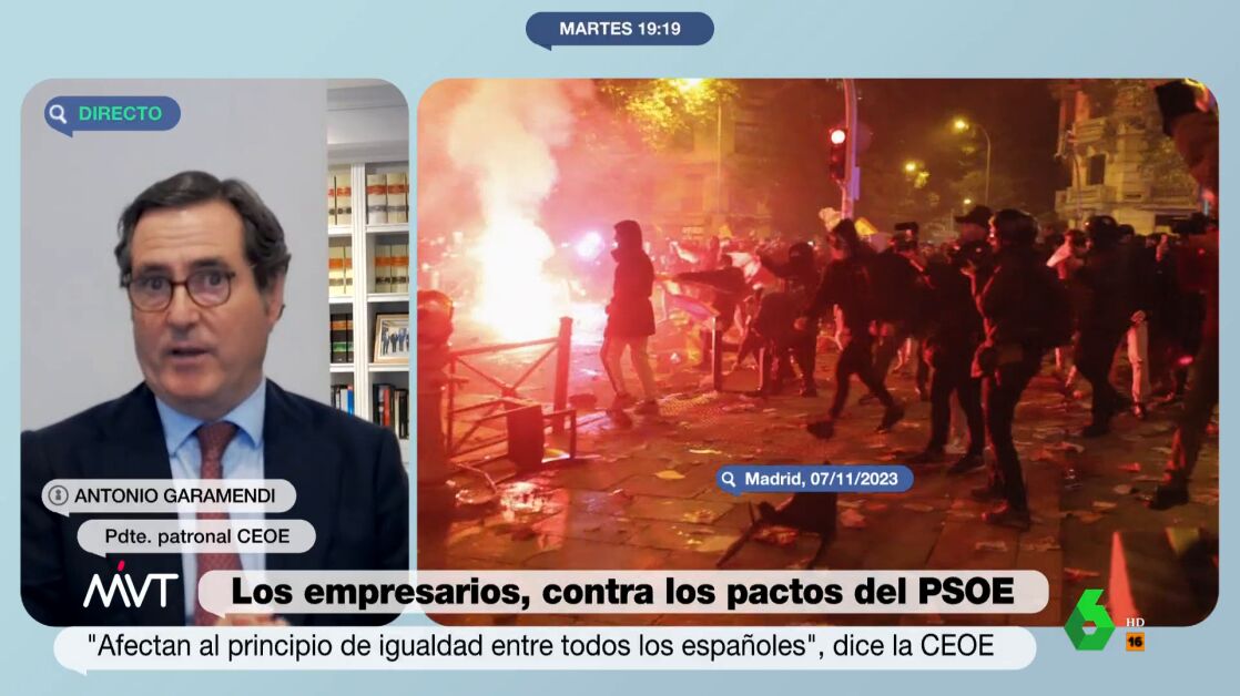 La patronal mantiene su 'no' a la ley de amnistía y a los acuerdos de gobierno del PSOE para la investidura de Pedro Sánchez. En Más Vale Tarde, el presidente de la CEOE, Antonio Garamendi, se muestra en desacuerdo con la visión del 'Financial Times' sobre la amnistía, considerando "grave" que se pueda "tocar" el poder judicial.