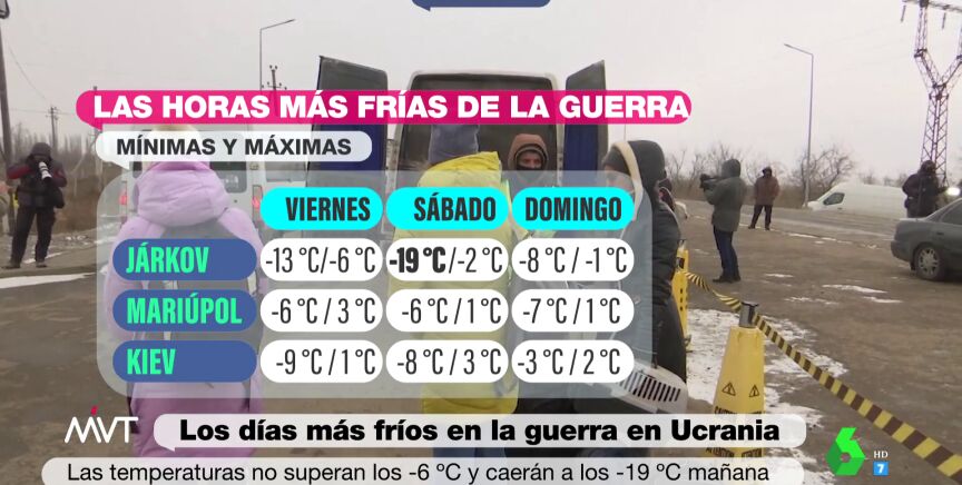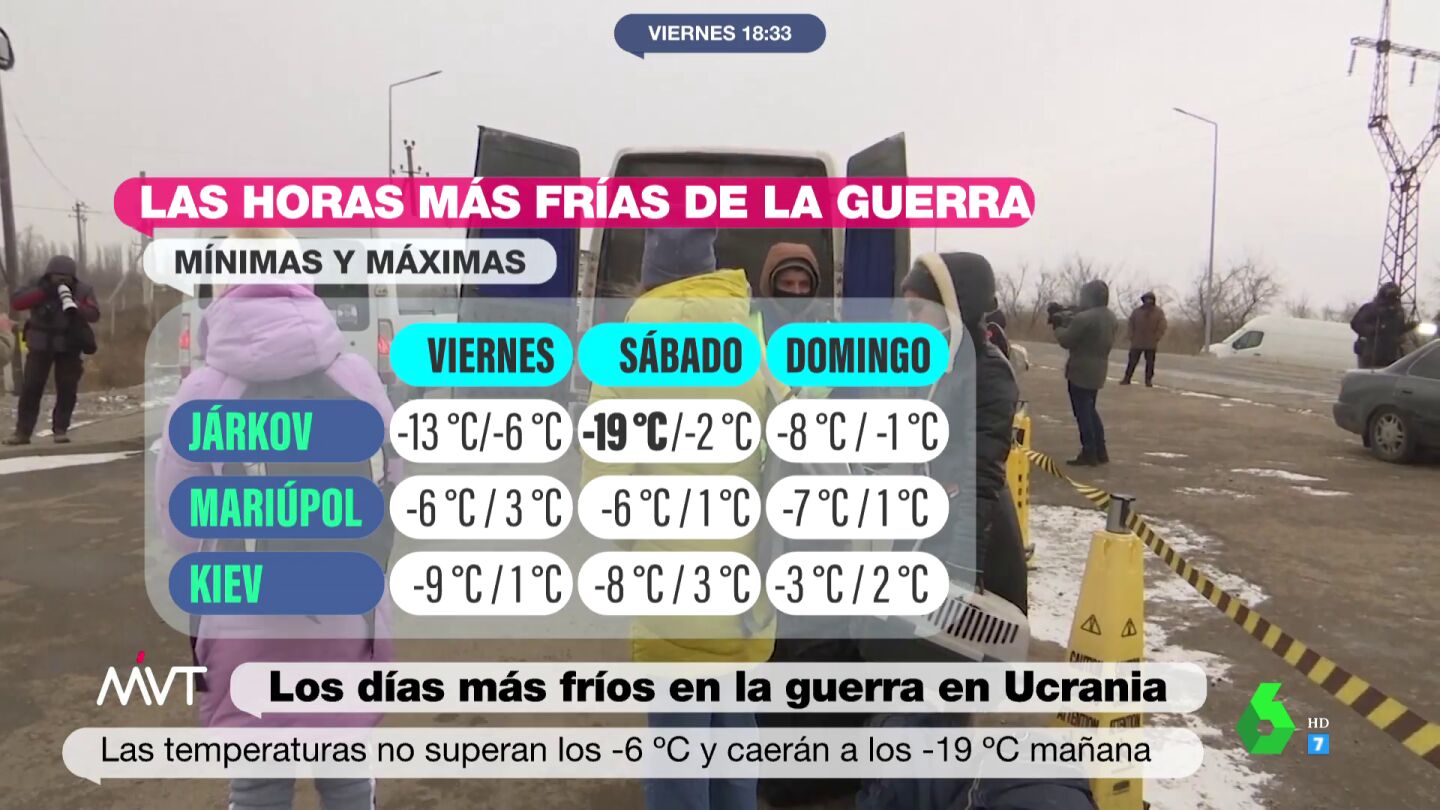Ucrania afronta días muy duro en lo que a climatología se refiere. "Lo peor está por llegar", como avisa el meteorólogo Francisco Cacho en el vídeo. Y es que apenas se van a registrar valores positivos en las temperaturas durante el fin de semana, al menos en Járkov, Mariúpol y Kiev.