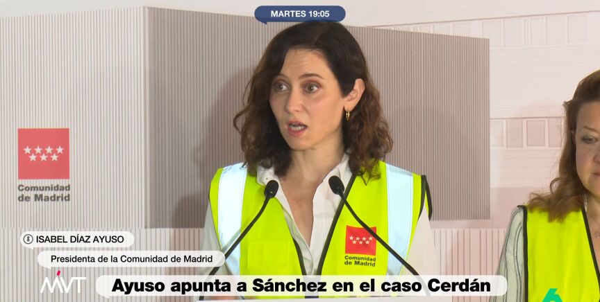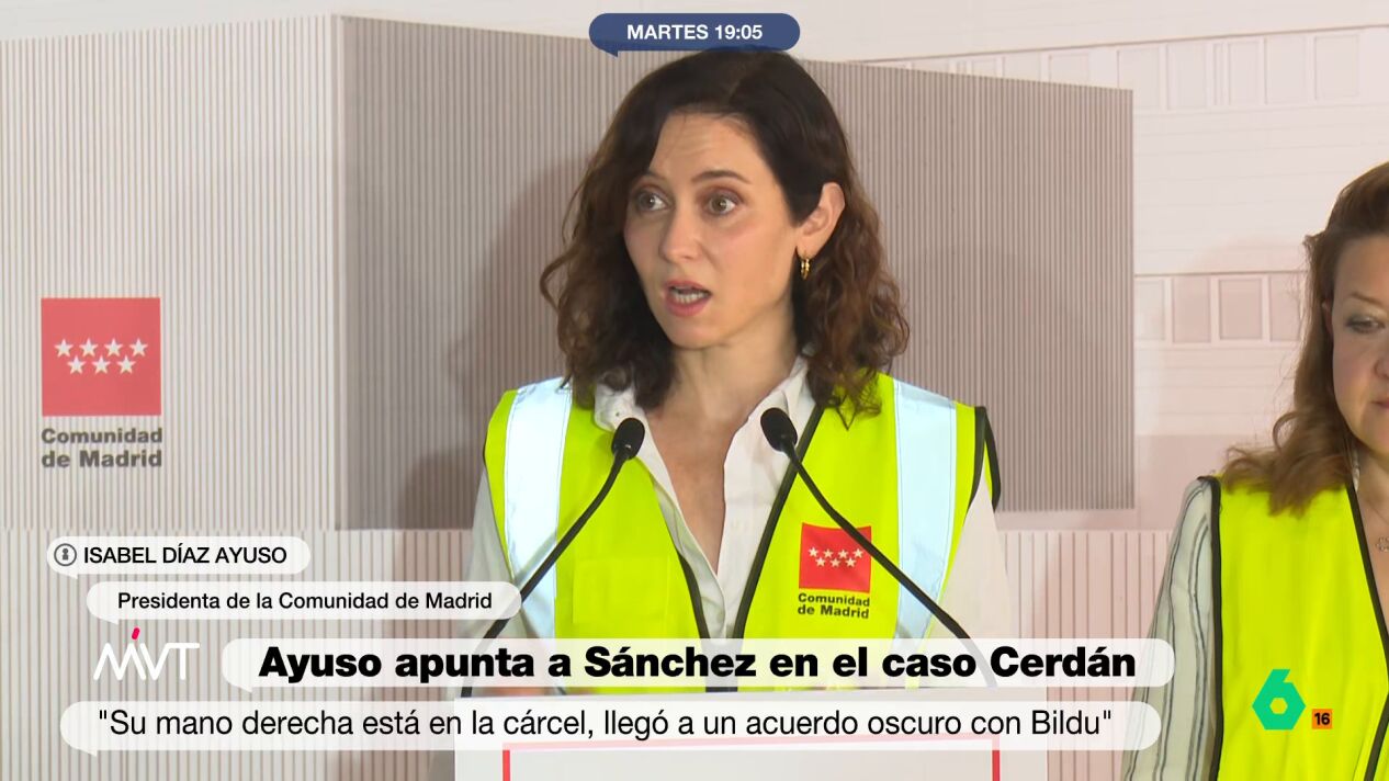 Isabel Díaz Ayuso ha vuelto a cargar contra Pedro Sánchez, del que dice que es el "primer beneficiario y encubridor" de la trama de corrupción protagonizada por Santos Cerdán, José Luis Ábalos y Koldo García.