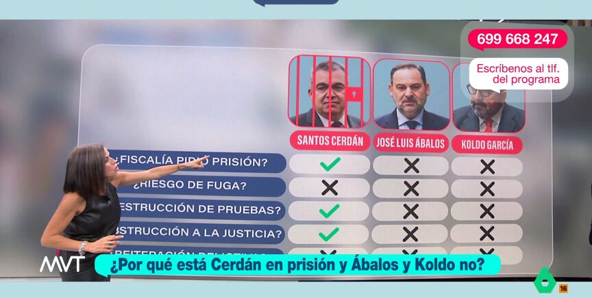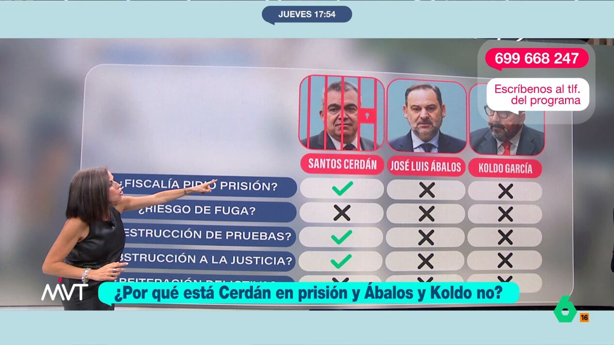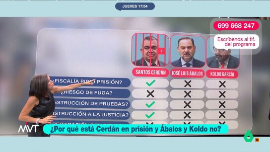 El juez del Tribunal Supremo ha liberado a Koldo García y al exministro José Luis Ábalos, al no encontrar elementos que justifiquen limitar su derecho a la libertad. Sin embargo, el exdiputado socialista Santos Cerdán permanece en prisión provisional desde el 30 de junio. La abogada Bea de Vicente explicó en Más Vale Tarde que la razón principal es que Cerdán es señalado como el líder de la trama y su investigación está en una fase muy inicial. Esto justifica un enfoque diferente en su tratamiento judicial en comparación con García y Ábalos.