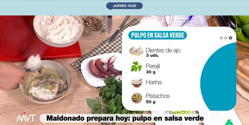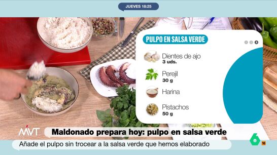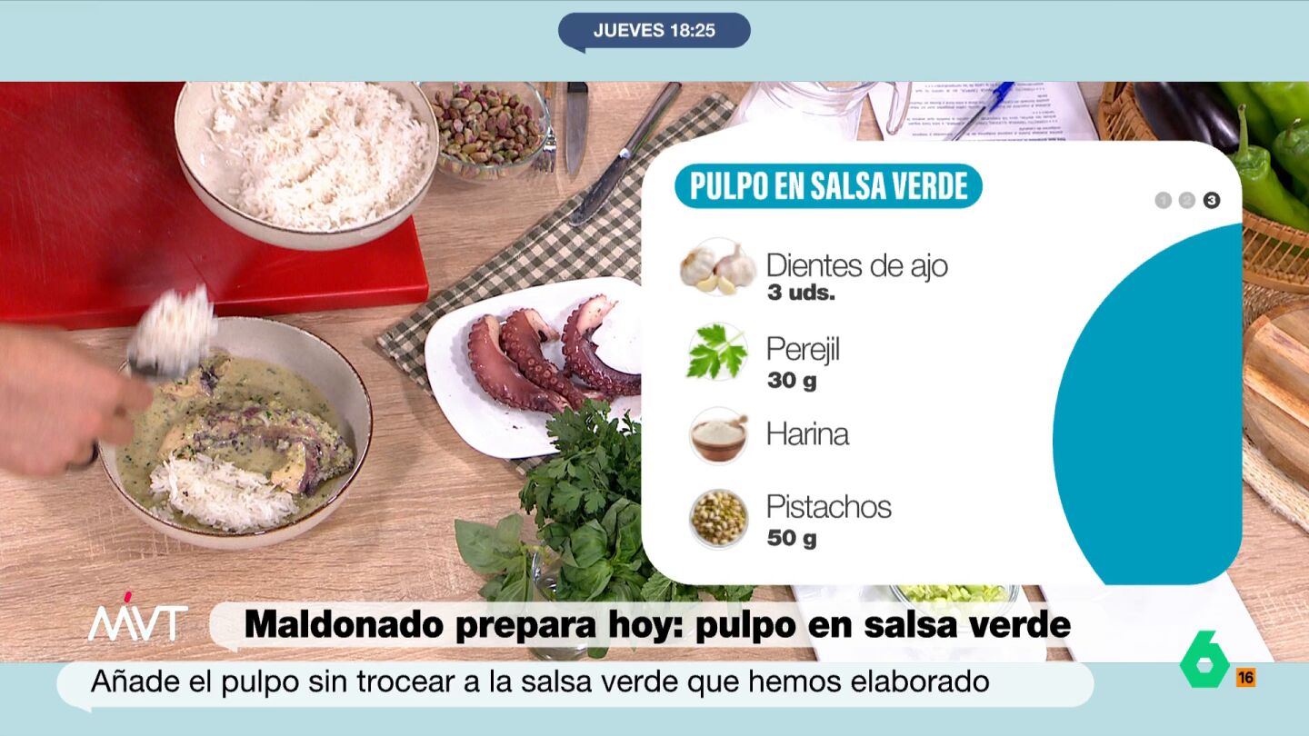 El chef con estrella Michelin Carlos Maldonado ha preparado este jueves en Más Vale Tarde un plato sencillo, original y muy rico: pulpo en salsa verde acompañado de arroz basmati. La receta es original porque lleva leche de coco, pistachos y mucho verde, entre verduras y hierbas aromáticas. Para elaborar este plato, hacen falta los siguientes ingredientes: