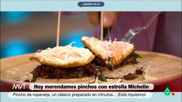 "De locos y low cost": así es el pincho de ropavieja que ha elaborado el chef estrella Michelin Carlos Maldonado este jueves en Más Vale Tarde para "aprovechar absolutamente todo lo que tenemos en casa". Para ello, se pueden usar tanto las carrilleras que se quedan en el fondo de la olla como las que nos quedan del día anterior.