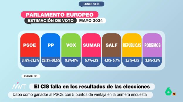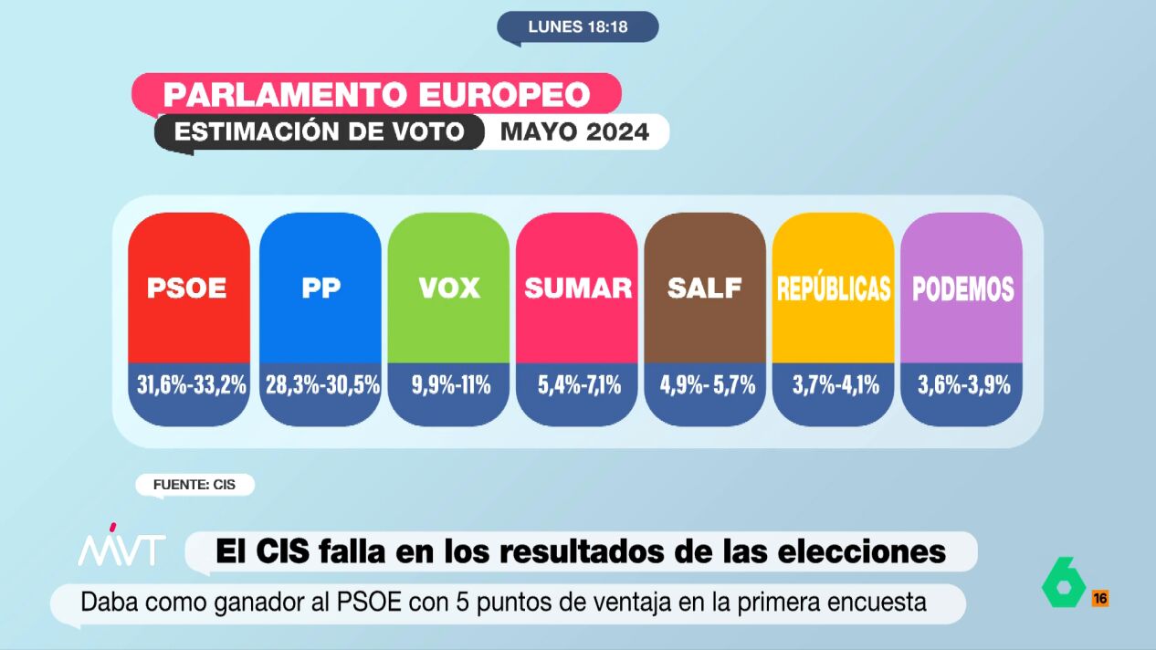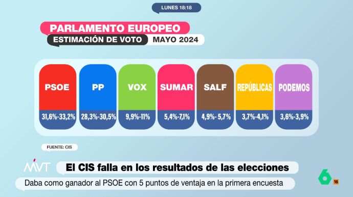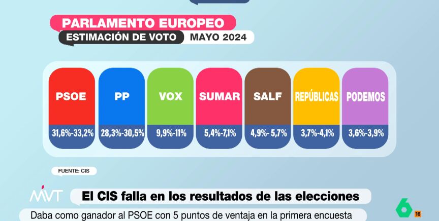 Para hacernos una idea, la estimación de voto del CIS en su última encuesta publicada en mayo de 2024 era la siguiente: PSOE (31,65%-33,2%), PP (28,3%-30,5%), Vox (9,9%-11%), Sumar (5,4%-7,1%), SALF (4,9%-5,7%), Repúblicas (3,7%-4,1%) y Podemos (3,6%-3,9%).
