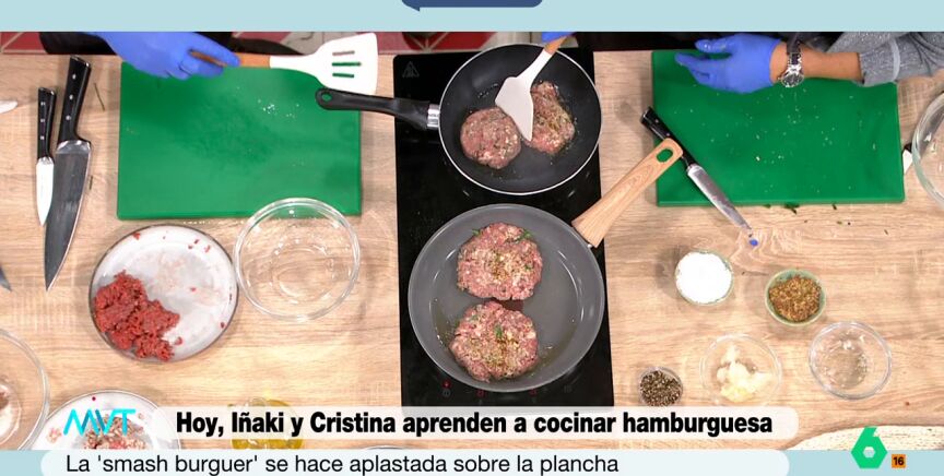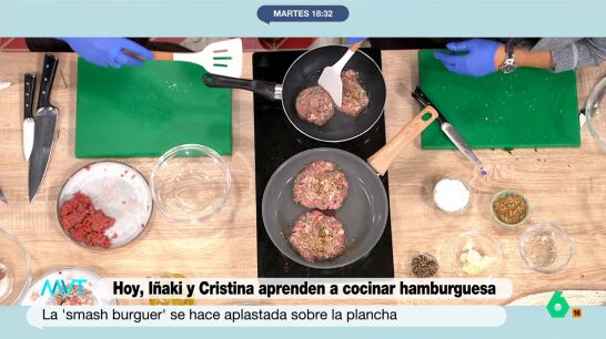 Iñaki López y Cristina Pardo se ponen del delantal para elaborar una hamburguesa a las órdenes del chef Carlos Maldonado. La presentadora va a elaborar una hamburguesa smash, es decir, una prensada. Para cocinar esta, además, hay un truco que comparte del cocinero.