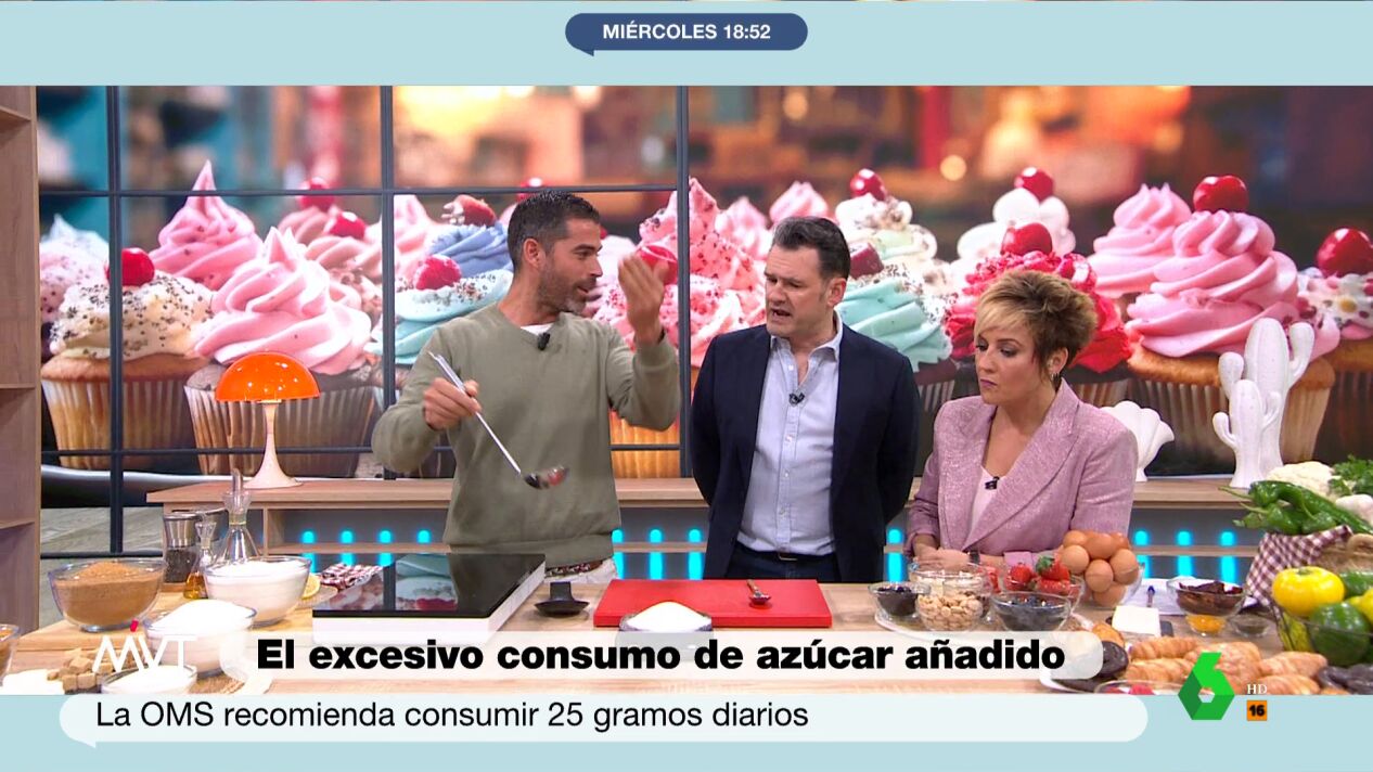 Hoy Pablo Ojeda habla en Más Vale Tarde sobre el azúcar, un componente en muchos casos demasiado presente en nuestra dieta. El nutricionista explica que la cantidad que se recomienda consumir diariamente de azúcares añadidos, según la OMS, sería de "una cucharada y media, 25 gramos". Por azúcares añadidos, explica, se entendería "lo que se encuentra fuera de la fruta o la patata".