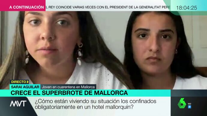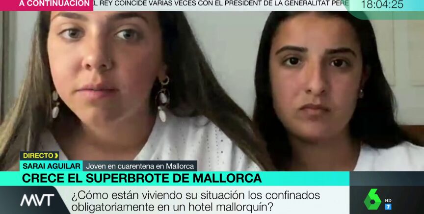 Sarai y Aroa, de 16 y 18 años, son dos de las jóvenes que se encuentran aisladas en el hotel COVID-19 de Mallorca para tratar de controlar el macrobroteoriginado por los viajes para celebrar el fin de curso. En Más Vale Tarde han contado que no todos los que se encuentran allí en cuarentena han participado de las fiestas, de los conciertos o los botellones ni han tenido contacto con los casos positivos notificados: "El domingo nos encerraron a todos en la habitación y nos dijeron que no nos quedaba otra que estar confinadas 10 días".