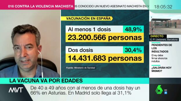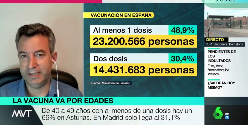 El doctor César Carballo, médico de Urgencias del Hospital Ramón y Cajal de Madrid, ha llamado a adelantar la segunda dosis de AstraZeneca a la población de 60 a 69 años "antes de que nos llegue la oleada de la variante delta". A pesar de que la vacunación ofrece protección frente a esta cepa, el porcentaje de inmunidad es muy superior cuando la persona posee las dos dosis.