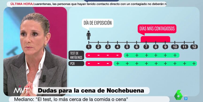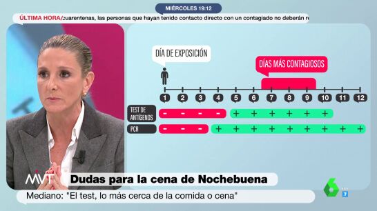 ¿Cuándo es mejor hacerse el test de cara a Nochebuena? "El test de antígeno para hacerlo de cara a una comida o reunión familiar, lo más cerca de la comida o de la reunión familiar", sostiene la neumóloga, que explica que, en el caso de la cena de Nochebuena, "mejor por la tarde". "Puede cambiar la carga viral, que es lo que va a hacer que el test dé positivo, en horas", explica Mediano, que concluye: "Cuanto más pegado al momento del evento, mejor".