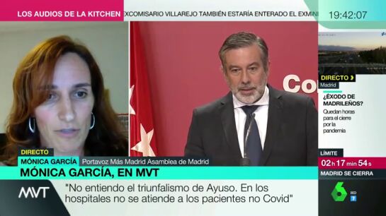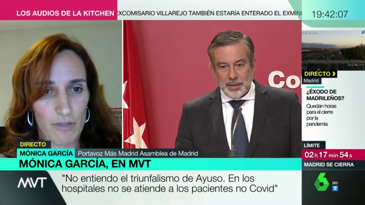 Mónica García, portavoz de Más Madrid en la Asamblea, ha expresado su enfado con el Gobierno regional en Más Vale Tarde. Para García, los miembros del Ejecutivo de la Comunidad de Madrid deberían pasarse "algún momento por un centro de salud o un hospital para comprobar de qué va esta pandemia".