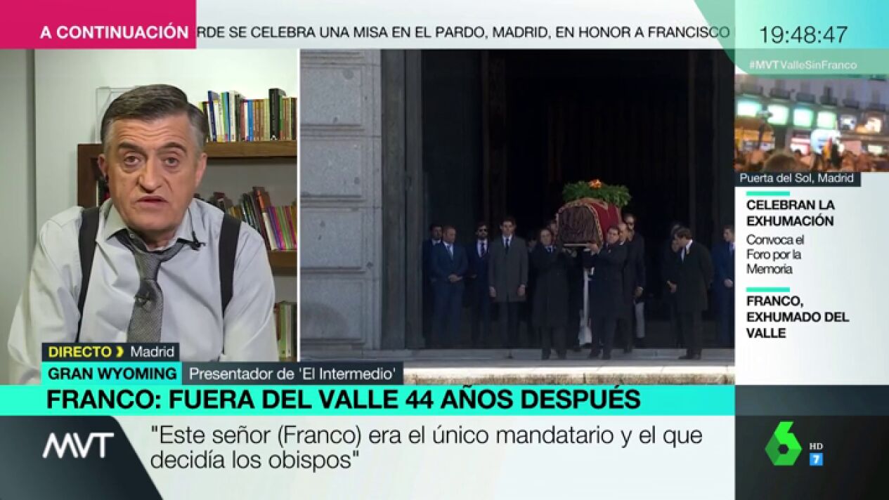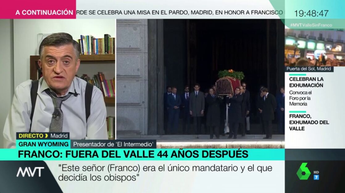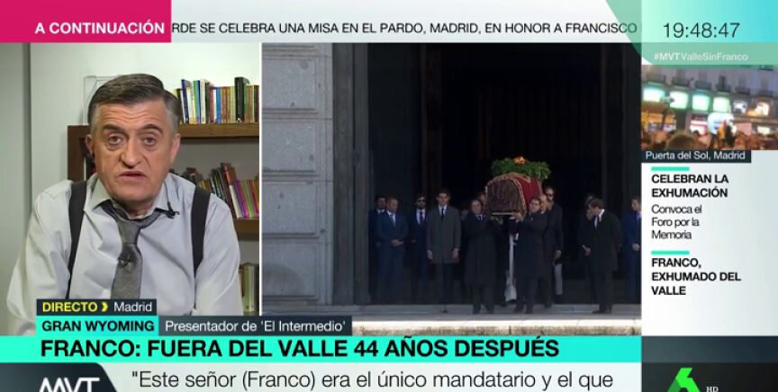 "Franco no es el pasado, está entre nosotros", ha sentenciado Wyoming, que también ha recordado que "Vox es una escisión del PP", y que la formación liderada por Abascal se ha referido en numerosas ocasiones a la exhumación como "profanación".