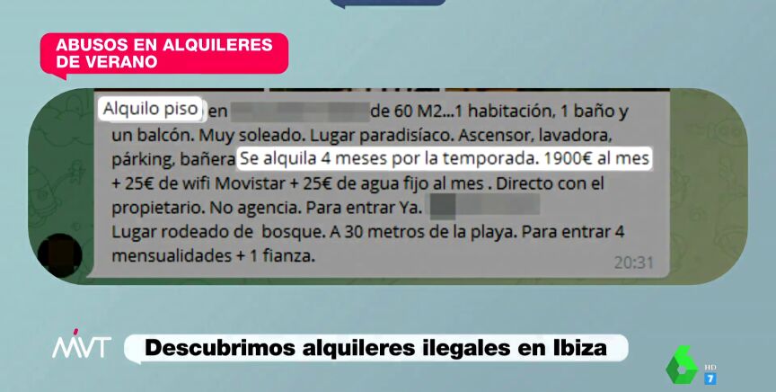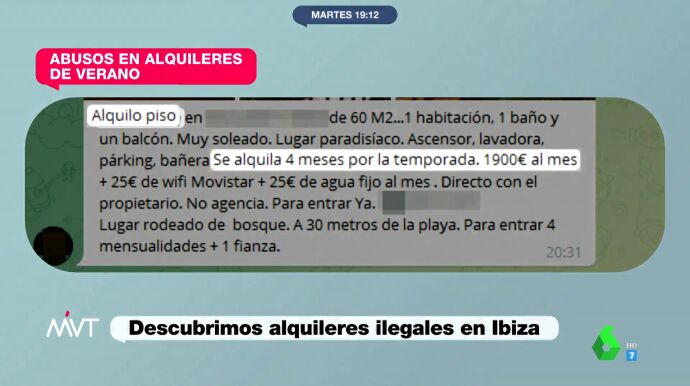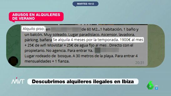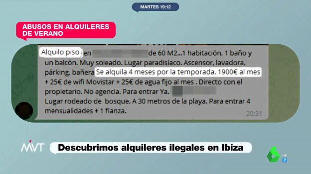 El equipo de Más Vale Tarde ha recibido información de abusos e ilegalidades que se cometen a la ahora de alquilar una vivienda vacacional para este verano. El abanico es amplio, como se puede ver en el vídeo que acompaña esta información. Por ejemplo, en Ibiza, uno de los lugares con el mercado de la vivienda más tensionado, los alquileres alcanzan los 1.900 euros al mes durante la temporada turística, entre junio y septiembre. En octubre se pagarían 1.200 y el resto del año, 900, si se quisiera seguir en esa vivienda.