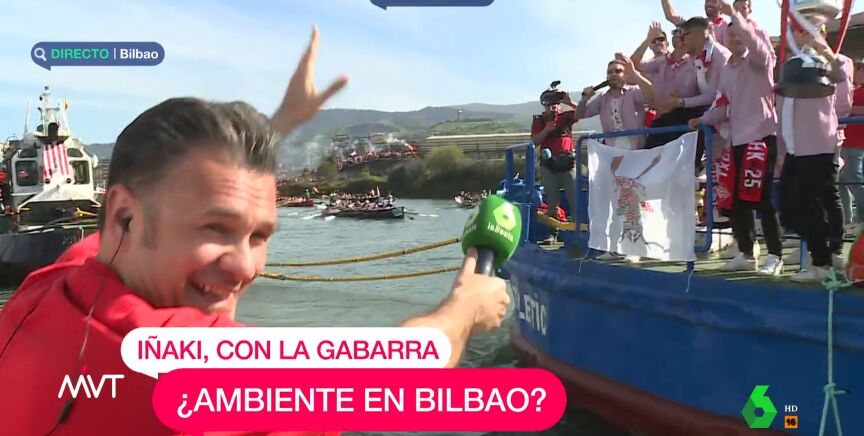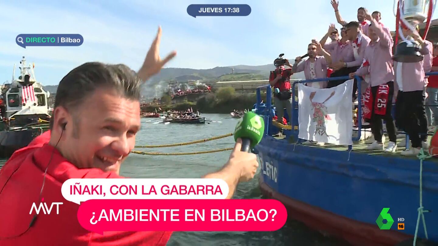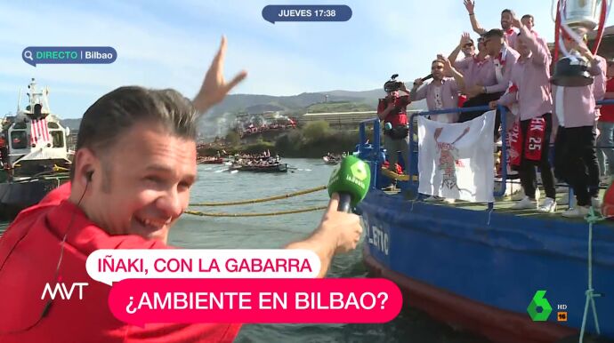 En una de las conexiones del periodista con Más Vale Tarde, este se encontraba a escasos metros de la Gabarra y ha llamado a los jugadores para que hablaran en directo y enseñaran la copa. "Aupa, chavales. ¡Zorionak!", les han chillado Iñaki López.