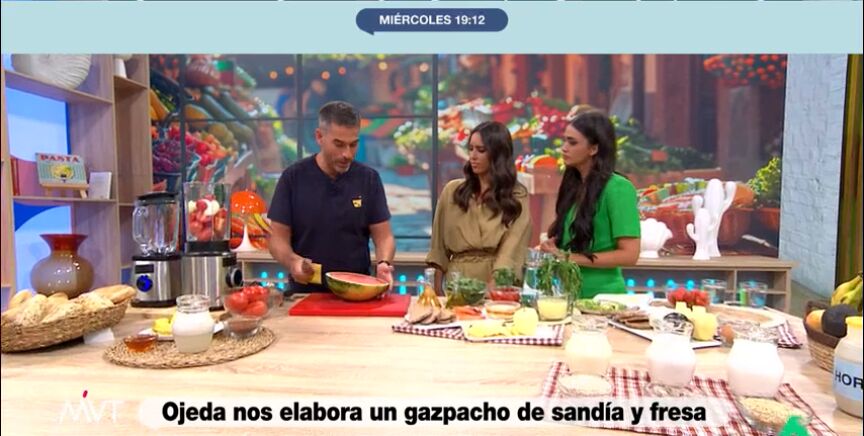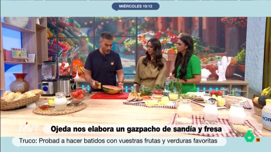 El gazpacho, una de las bebidas más emblemáticas del verano español, ha sido la receta de Pablo Ojeda, este miércoles, en Más Vale Tarde, ha creado una nueva receta de gazpacho: con sandía y fresas. La presentadora del programa, Marina Valdés, ha lanzado al nutricionista la cuestión de ¿engorda? Ojeda explicó que el gazpacho, a pesar de ser una opción saludable y rica en nutrientes, contiene más calorías que el agua, lo que podría influir en el balance calórico diario si se consume en exceso.