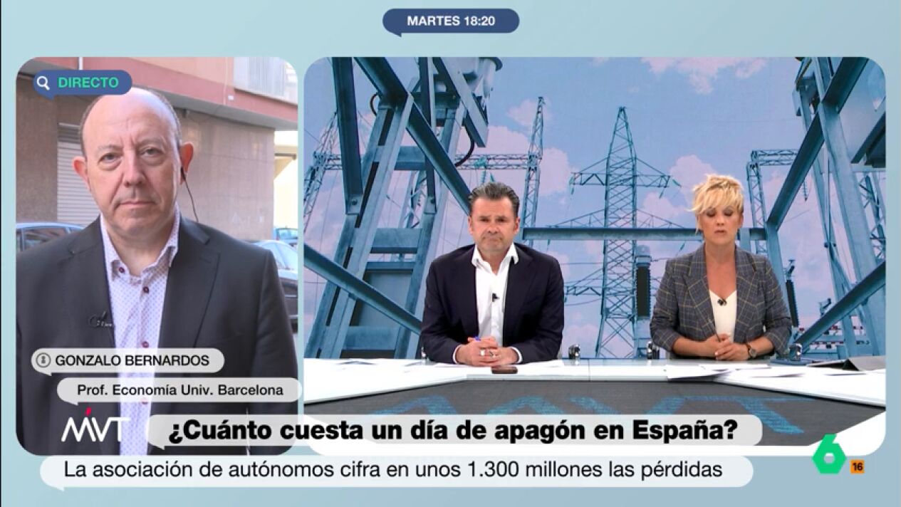 Gonzalo Bernardos conecta con Más Vale Tarde para hablar sobre las consecuencias económicas que podría tener el apagón que sufrió la península en el día de ayer. "¿Cuál te parece el cálculo más fiable del dinero que pudimos perder?", pregunta Cristina Pardo. Como expone la presentadora, se habla de pérdidas que van desde los 1.300 millones hasta los 4.500 millones de euros.
