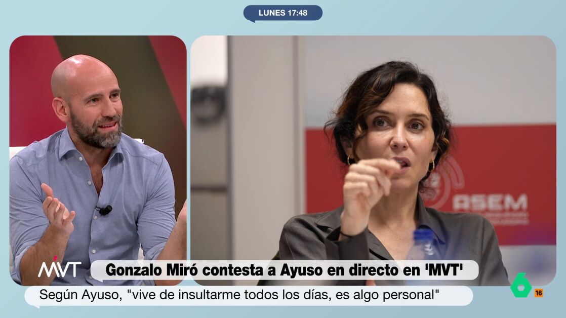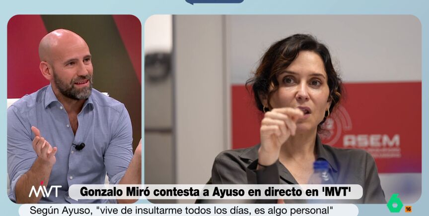 "No penséis en el País Vasco que en Madrid somos todos igual de catetos", afirmaba el colaborador de Más Vale Tarde. Ayuso no ha tardado en responder al 'dardo' de Miró en 'Espejo Público3 después de que le hayan mostrado las imágenes. La presidenta madrileña ha afirmado, entre otras cosas, que el colaborador vive de insultarla todos los días.