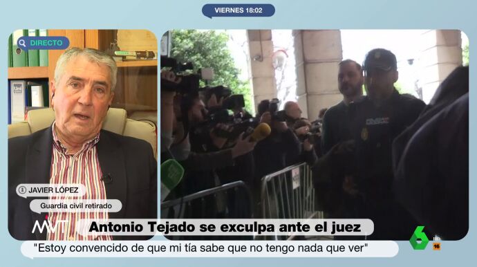 Javier López es Guardia Civil retirado y ha hablado en Más Vale Tarde sobre los siguientes pasos de la investigación, así como de la prisión provisional en la que se encuentra Tejado desde que fue detenido por el robo en casa de su tía, puesto que no existen "pruebas contundentes" por sí solas para mantenerlo en esta situación. No obstante, asegura que existen "una serie de indicios que pueden llevar a la conclusión" de quienes fueron los autores, entre los que estaría el sobrino de del Monte.