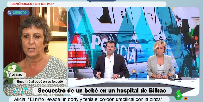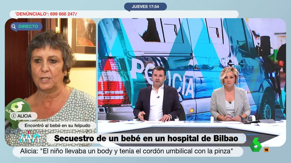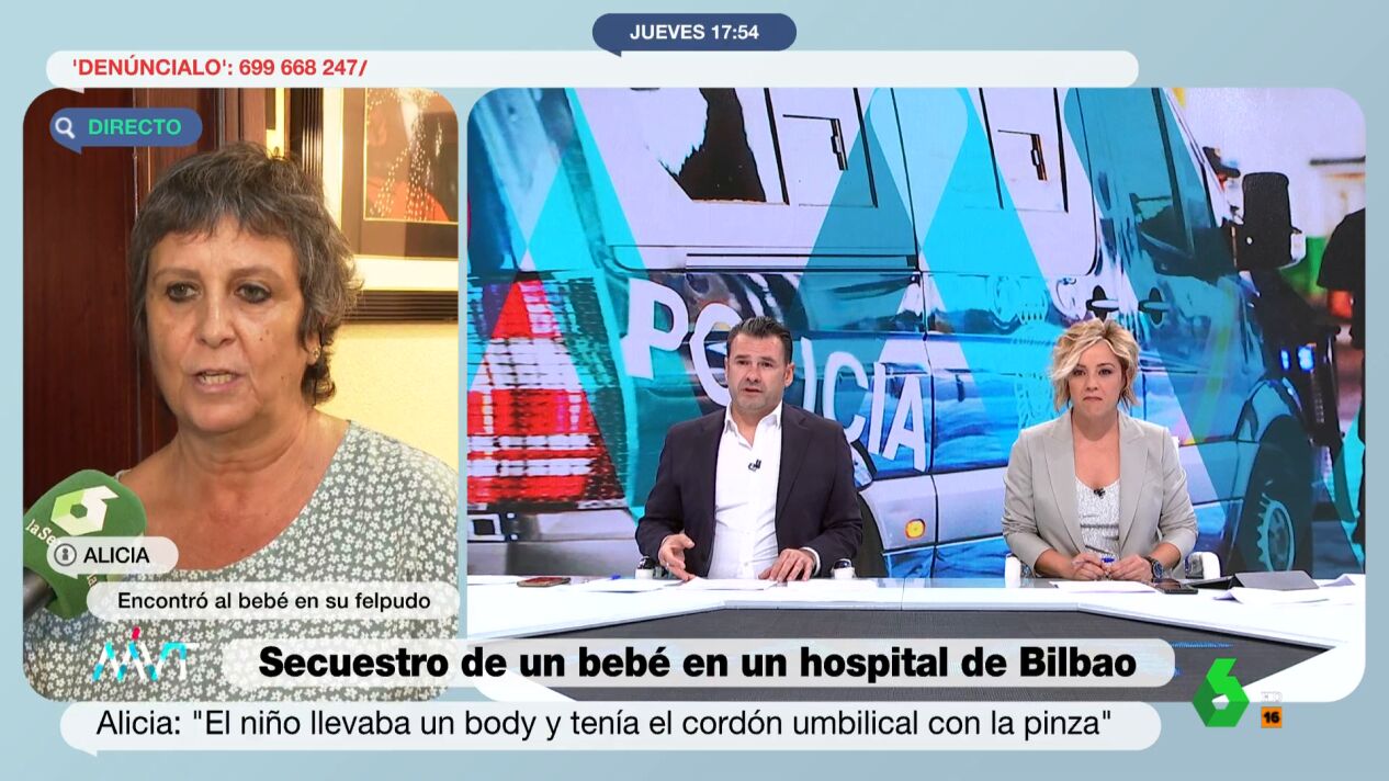 "He dicho 'qué raro'. He mirado por la mirilla y no he visto a nadie. He abierto y ahí estaba. He gritado: 'Chicos, que han dejado un crío en el felpudo'", asegura. Alicia niega conocer a la mujer que ha cometido el secuestro, preguntándose por qué motivo lo ha dejado en su puerta.