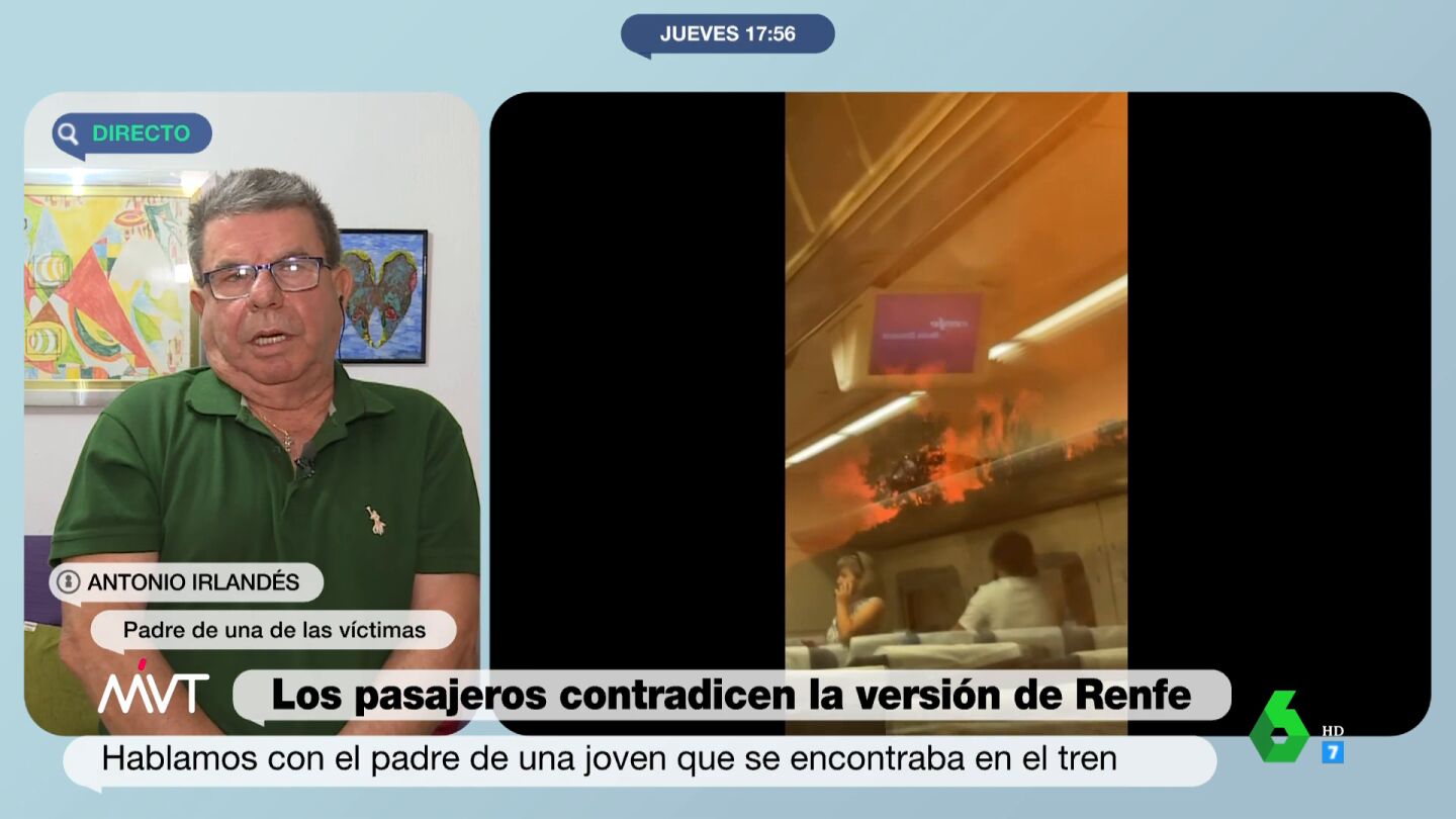 Antonio Irlandés recuerda la primera llamada que tuvo con su hija, en la que ella le dijo: "Estamos vivos, estamos vivos". Afirma que "ni Renfe ni Generalitat" se han puesto en contacto con ellos desde que sucedieron los hechos: "Me voy a contener porque tengo educación".