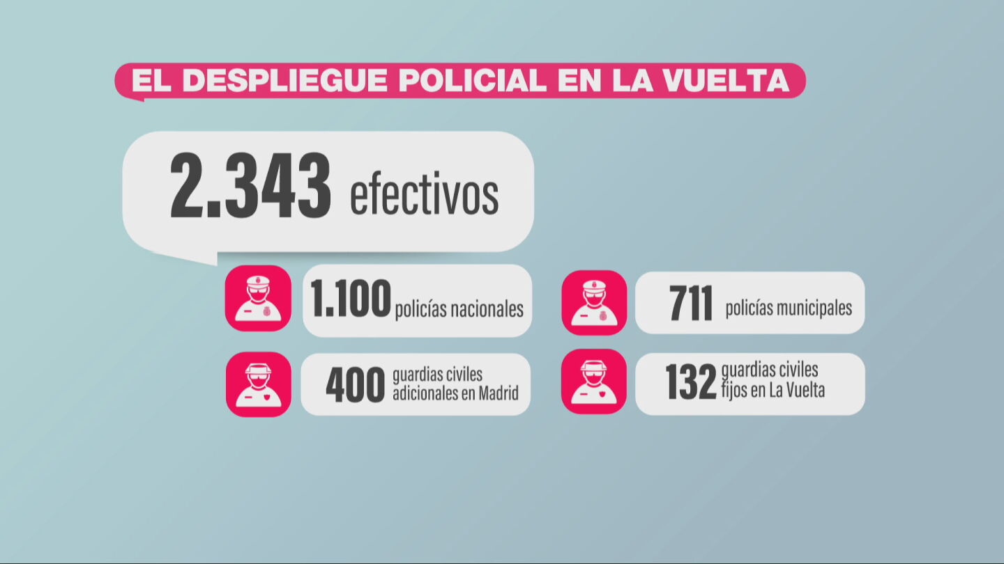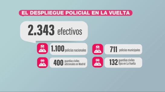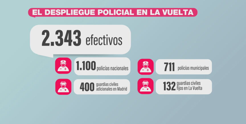Con todo esto en mente, se ha diseñado en la mañana de este miércoles e incluye a 2.343 agentes en total. En concreto, se va a distribuir a 1.100 agentes de la Policía Nacional, 711 policías municipales, un refuerzo de 400 guardias civiles que se suma a los ya 132 agentes de este cuerpo que están fijos durante la prueba deportiva. Sin olvidarnos de sus 59 agentes en motos, los 28 todoterreno y el helicóptero de la Guardia Civil.
