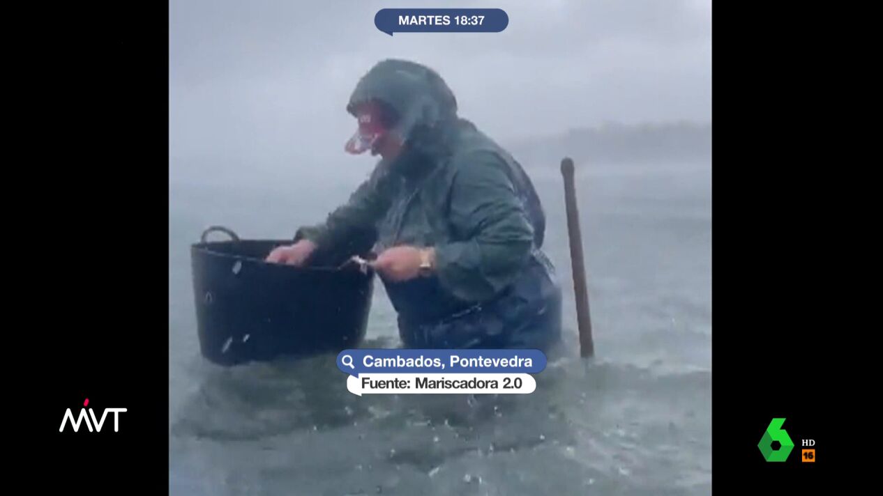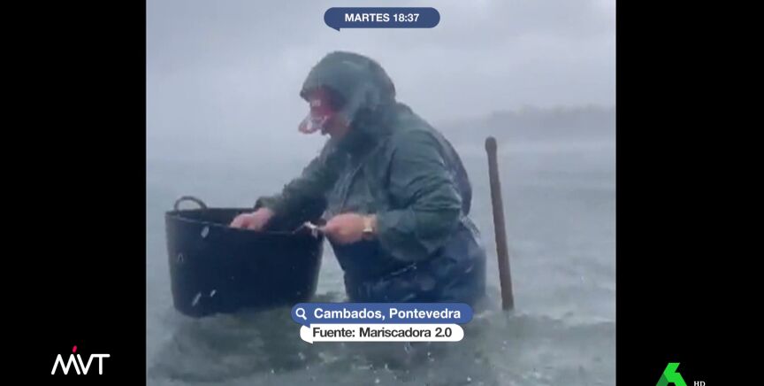 Las impactantes imágenes del trabajo de una mariscadora en pleno temporal