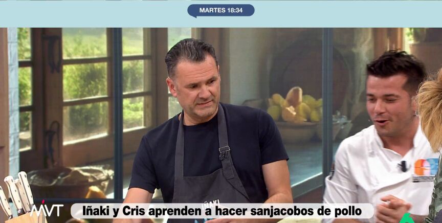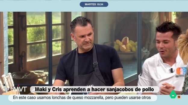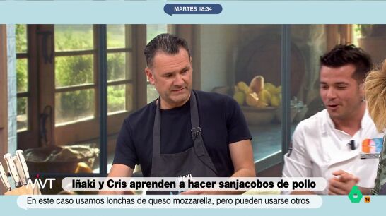 "Es el primer sanjacobo de régimen que hago", comenta Iñaki, mientras que Maldonado le pregunta "cuántos sanjacobos has hecho en tu vida". "Uno", reconoce el presentador ante la risa del chef.