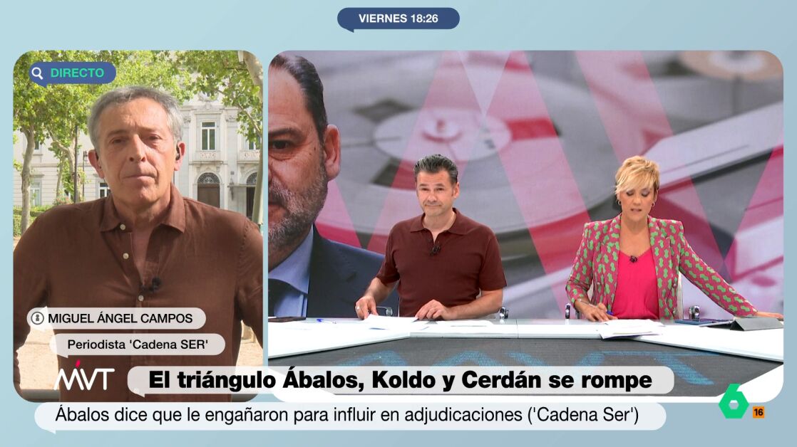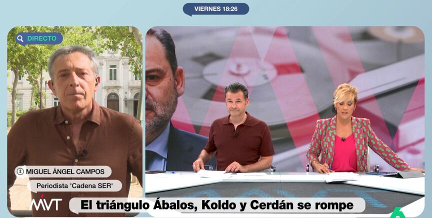 Miguel Ángel Campos, periodista de Cadena Ser, conecta con Más Vale Tarde para hablar del enfado de José Luis Ábalos con Pedro Sánchez, a quien acusa de haber "encapsulado en él" el caso Koldo y de haberle "despreciado y denigrado", en vez de proceder como se hizo con Santos Cerdán, de quien –asegura- que se defendió su inocencia hasta "el último momento", incluso después, cuando "algunos medios de comunicación ya desvelaban en líneas generales lo que decía el informe de la UCO".
