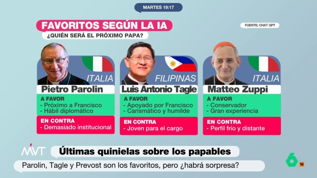 Además la IA hace una lista de pros y contras, como que a favor de Parolin y Tagle juega su proximidad con Francisco I, mientras que en su contra encontramos que el primero es un perfil demasiado institucional y el segundo quizá joven para el cargo.