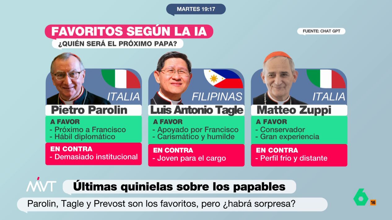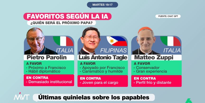 Más Vale Tarde pregunta a la inteligencia artificial por su particular quiniela de favoritos para convertirse en el nuevo papa. Parolin, Tagle y Zuppi son sus candidatos, pero ¿cuál es su elegido? La respuesta, en este vídeo.