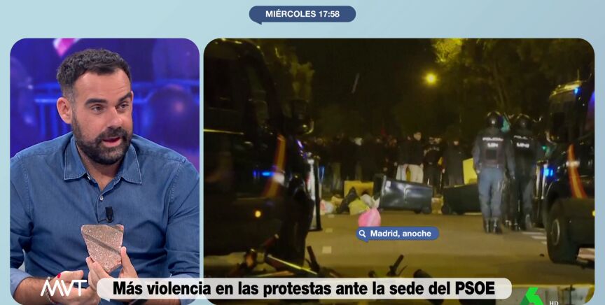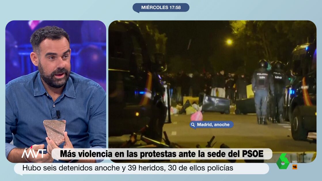 "Con esto matas a alguien", apunta en este vídeo de Más Vale Tarde Beatriz de Vicente al ver el trozo de adoquín que unos manifestantes lanzaron a Javier Bastida mientras informaba de las protestas en la sede del PSOE de la calle Ferraz.