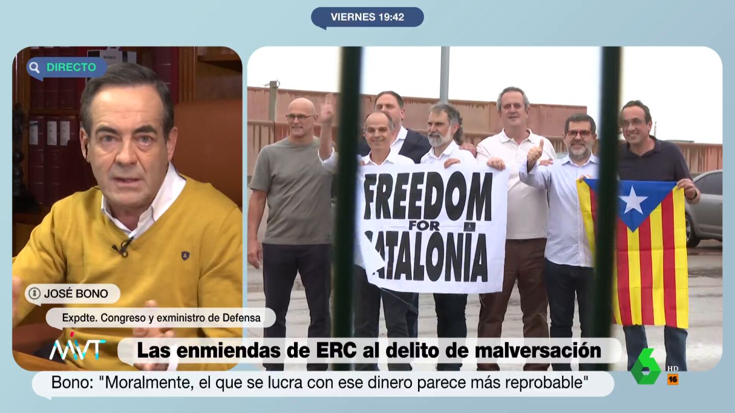"Yo creo que es discutible. Me repugna más el enriquecimiento individual, pero el daño que el Código Penal pretende evitar en el segundo caso es muy grave". "El que se lleva el dinero a su bolsillo que vaya al infierno, pero el que se lleva el dinero público para cometer graves delitos y subvertir el orden constitucional también es grave y no debe quedar despenalizado", ha añadido Bono, haciendo referencia a los políticos independentistas condenados por malversación.