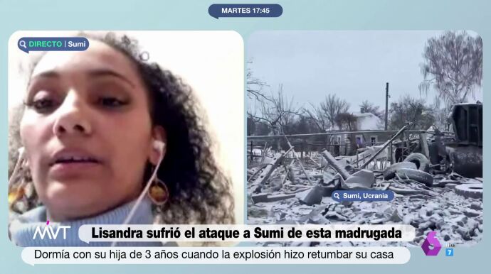 Lisandra vive en Sumy, está casada con un ucraniano y tiene una niña de tres años, a la que estaba durmiendo cuando anoche escuchó el sonido de un avión. Según relata en Más Vale Tarde, cogió a la niña y se dirigió al pasillo de la vivienda porque no les daba tiempo a bajar al refugio: "Enseguida escuchamos las bombas, cómo se estremeció la casa completa, fue terrible", relata.