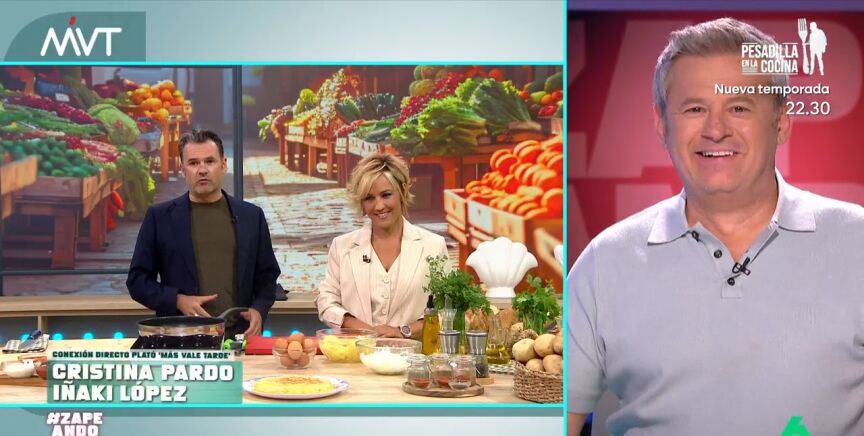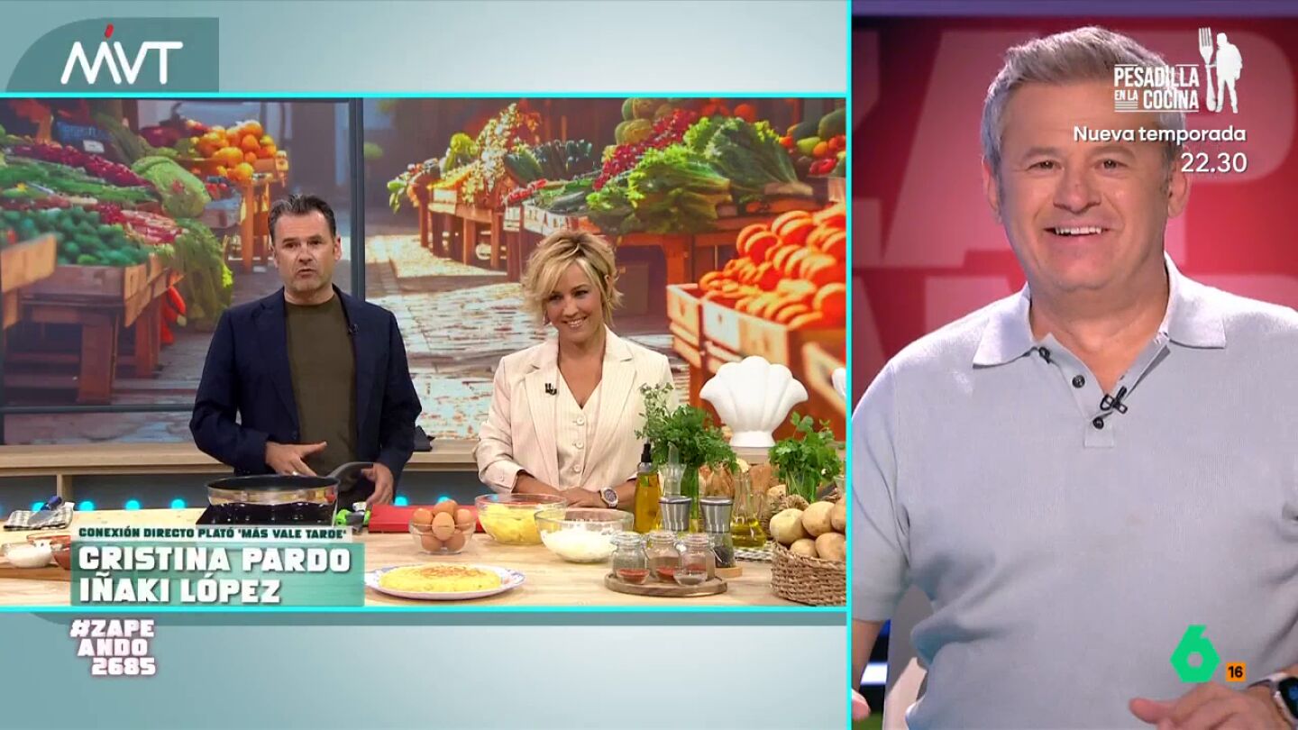 "Lo he estado mirando", responde Dani al 'dardo' de Iñaki. "Sí, a ver si os ponen un autobús para ir y volver a casa porque... no sale a cuenta", añade, irónico, López. "No conducía yo, que lo sepas, lo hacía un profesional, por eso estamos bien todos", responde Miki. "Claro, que él no es como Dani Mateo quiere decir", añade Cristina Pardo.