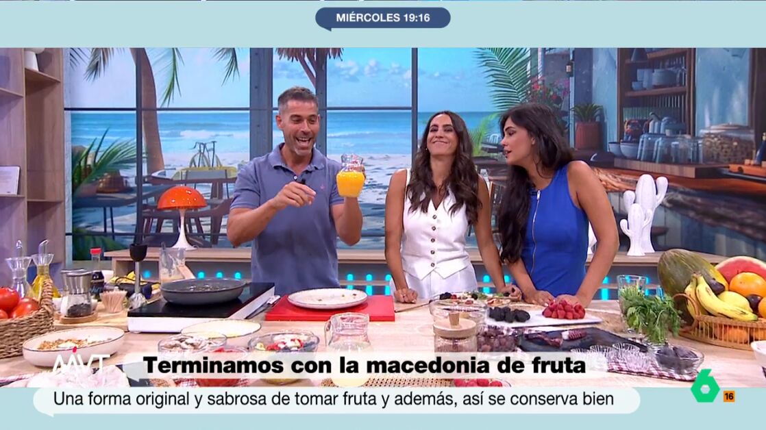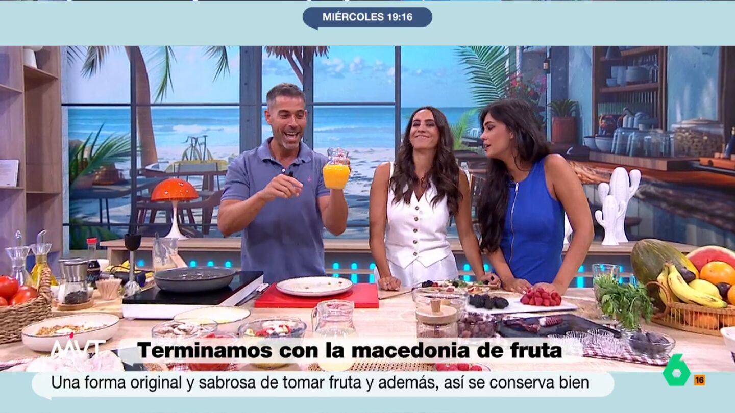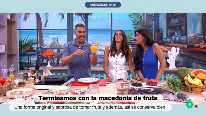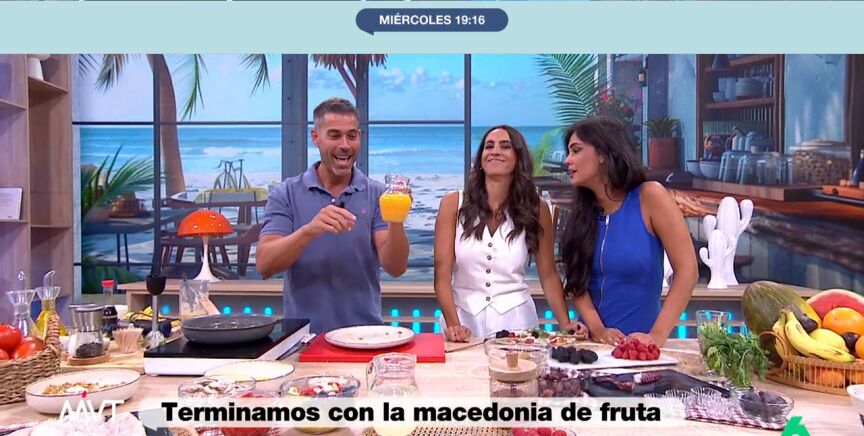 Pablo Ojeda remata su 'menú playero' de hoy en Más Vale Tarde con una macedonia de frutas que riega con zumo. Aprovechando el momento, manda en este vídeo un mensaje en el que desmonta uno de los grandes mitos de padres y madres.