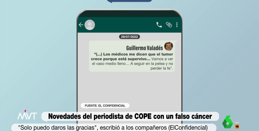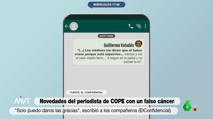Seguimos conociendo detalles de la presunta estafa perpetrada por Guillermo Valadés, productor de Tiempo de Juego (Cope), hacia sus compañeros de programa, a quienes pidió dinero para tratar un falso cáncer. Este miércoles, 'El Confidencial' publica algunos de los mensajes que Valadés mandaba a través de un grupo con algunos de sus compañeros, a quienes informaba de sus avances en el tratamiento.