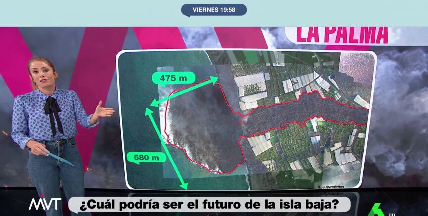 En la actualidad, "la que se ha formado ahora en La Palma tiene 475 metros de largo y 580 metros de ancho, y, seguramente, irá creciendo mar adentro hasta que se encuentre con lo que se conoce como el talud, la zona donde el mar empieza a profundizarse y, por tanto, en esa zona no puede consolidarse. Por tanto, no queda mucho para avanzar hacia dentro, pero sí hacia los lados", ha indicado Zubiaurre.
