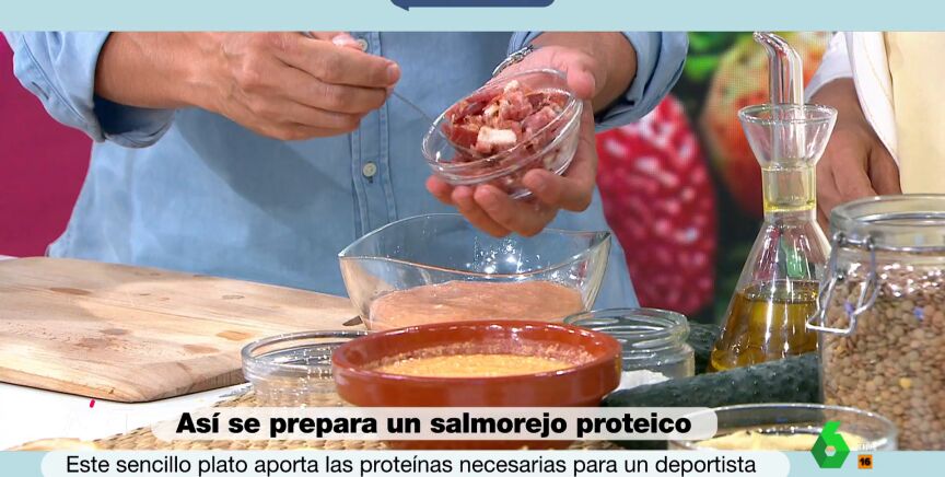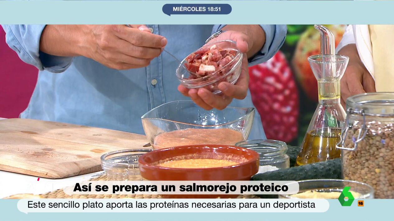 "Hay un salmorejo sin pan proteico", avanzaba Pablo Ojeda a Cristina Pardo en Más Vale Tarde. Ese salmorejo permite ayudarnos a recuperar la energía después de un duro entrenamiento. La presentadora escucha sorprendida la receta de este plato, que es, para Ojeda, "lo más sencillo del mundo".