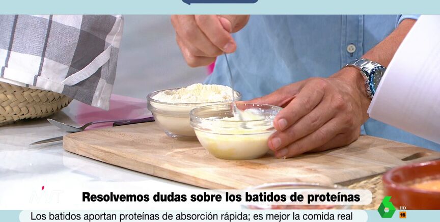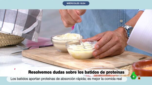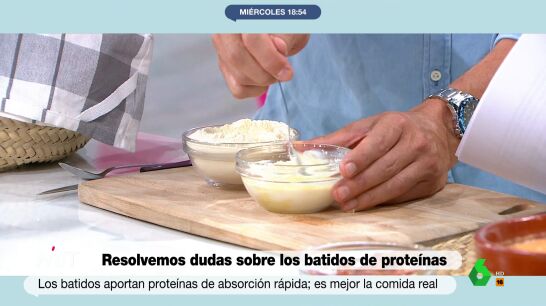 En el vídeo que acompaña a estas líneas, mezcla 30 gramos de los polvos de estos batidos con leche, aunque reconoce que él los mezcla con yogur, lo que hace que se aumente el consumo de proteína "con pocas calorías".