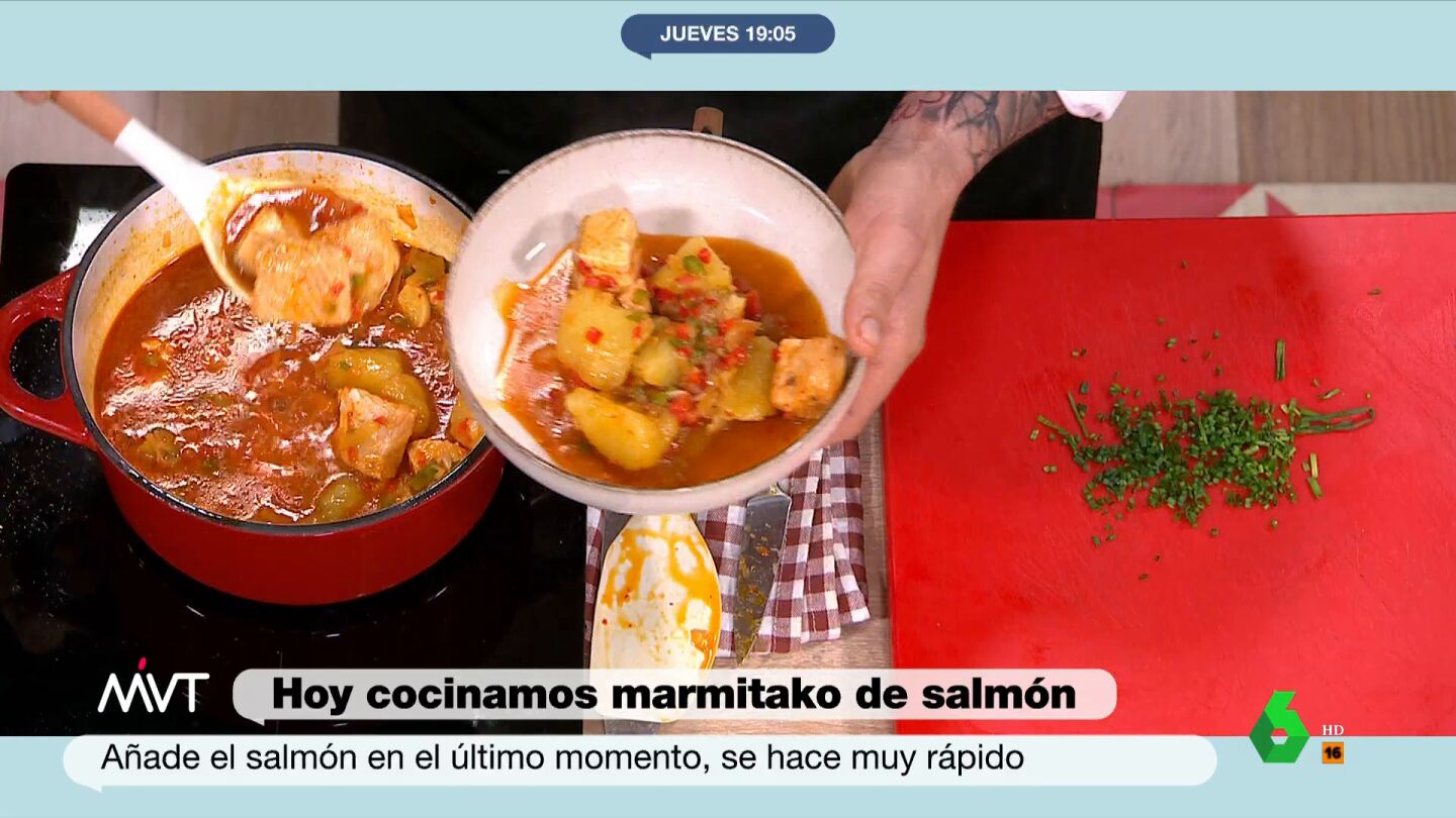 Como cada jueves, Pablo Ojeda y el chef con estrella Michelin, por su restaurante 'Raíces', Carlos Maldonado, preparan una nueva receta sana y deliciosa que, en esta ocasión, es un marmitako de salmón. Iñaki López explica en el vídeo sobre estas líneas que la palabra 'marmitako' viene de marmita, que era donde los marineros echaban el pescado que encontraban para cocinarlo con patatas: "No aparecía fletán, no aparecía bonito, a veces echaban hasta delfín", apunta.