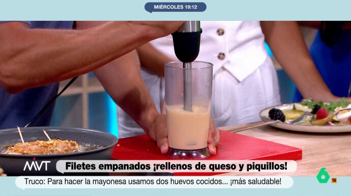 Para este último, Ojeda lo acompaña de una mayonesa y aprovecha para explicar que, ante posibles intoxicaciones, "el problema no está en el huevo, sino en la cáscara". De este modo, desvela un truco para preparar una mayonesa saludable donde el huevo en lugar de crudo va cocido. Además añade aceite de girasol, sal, un toquecito de soja y zumo de limón.