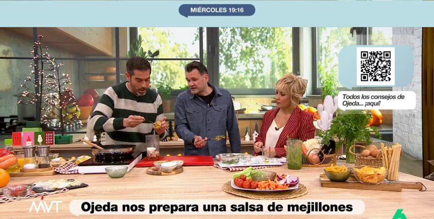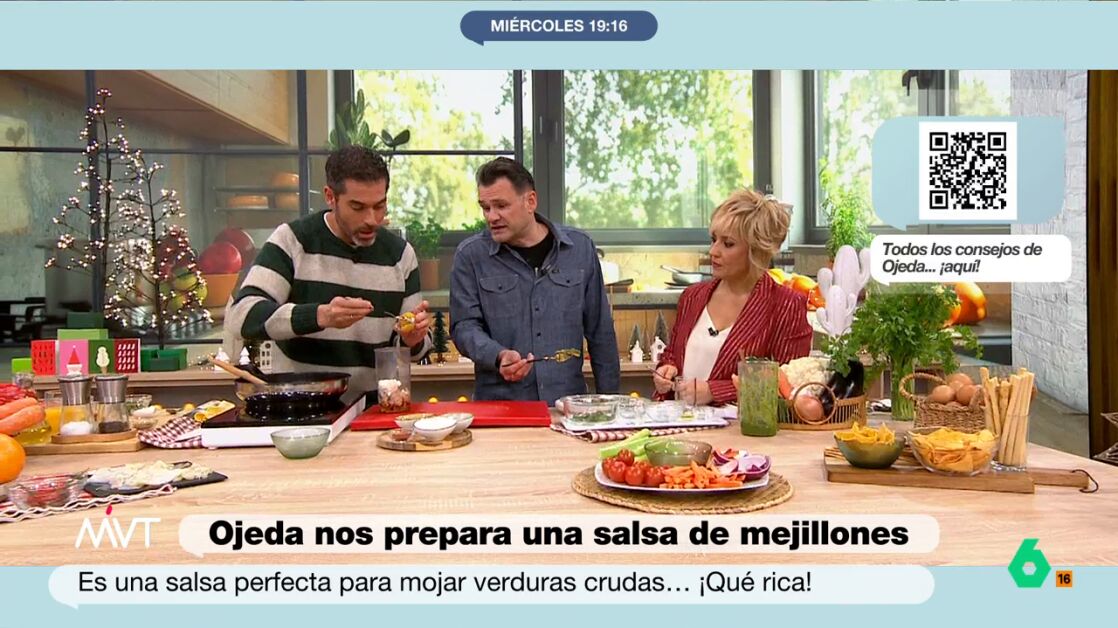 Ojeda, en este caso, propone acompañar estas verduras con una salsa de mejillones. Para elaborarla tan solo hace falta una lata de mejillones. Ojeda escoge los mejillones en escabeche picantes, pero se puede usar cualquier otro tipo. A esto, se añade una lata de atún al natural, "para que no mate el sabor".