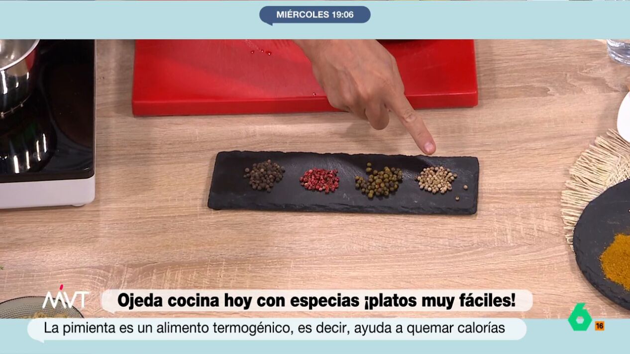 Ojeda indica que no todas las pimientas son iguales. Aunque las propiedades de todas ellas son muy parecidas la diferencia radica en el sabor que aportan al plato. Pablo hace degustar a Iñaki López y Cristina diferentes tipos y, como explica, la pimienta negra, verde y blanca son los mismo pero cambia el tiempo que han estado en la mata y su procesado. En cambio, la pimienta rosa no es pimienta sino que es una baya que no pica. "No se puede utilizar igual que la pimienta normal porque puede aromatizar un plato pero también se lo puede cargar porque mata sabores", indica.