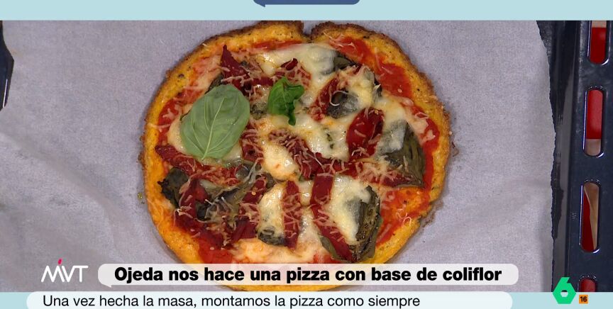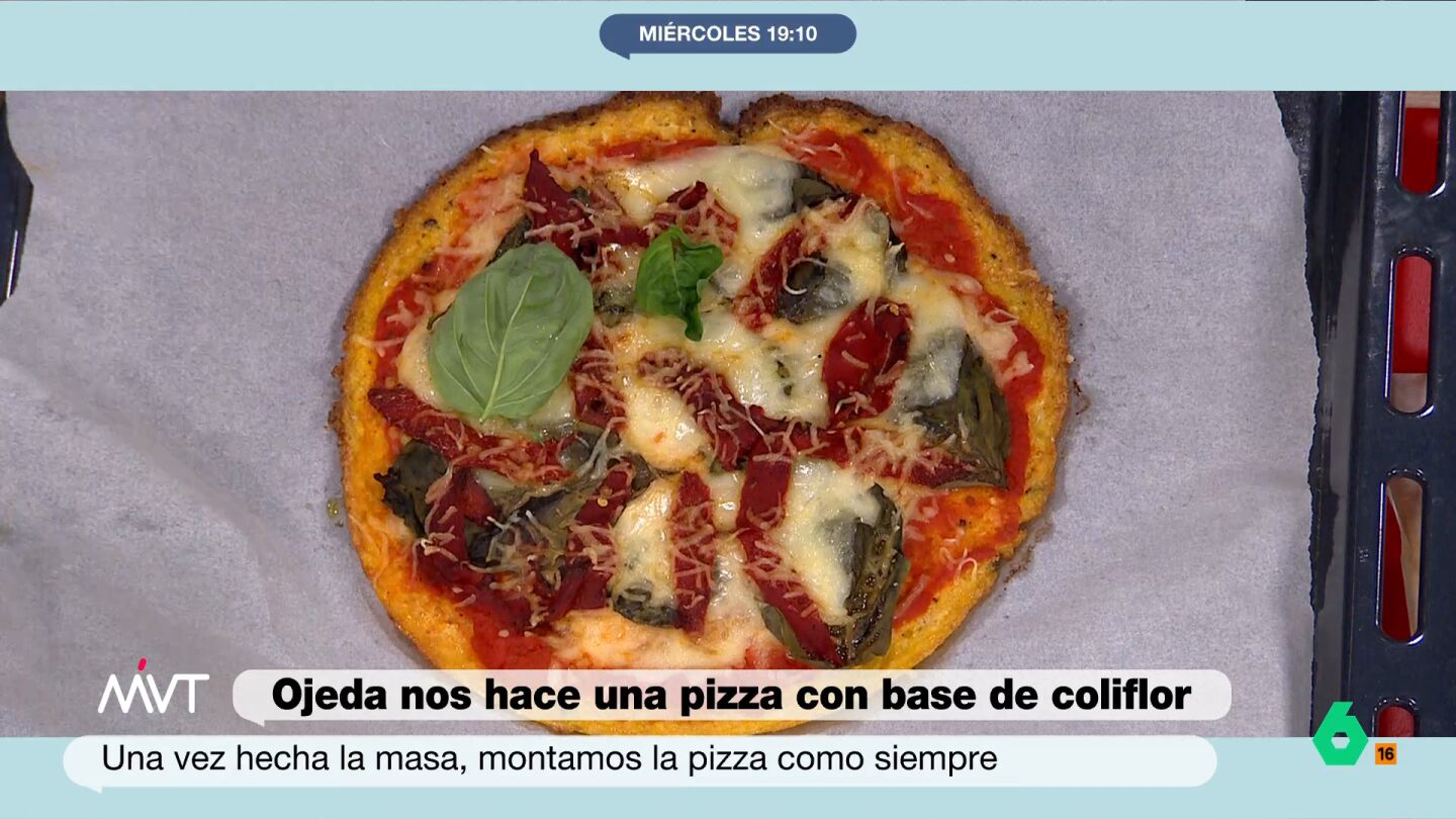 El nutricionista propone una receta de pizza. Ojeda, en lugar de utilizar la base más tradicional de este popular plato italiano, propone sustituirla por una base de coliflor. Aprende cómo elaborarla en el vídeo principal.