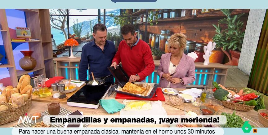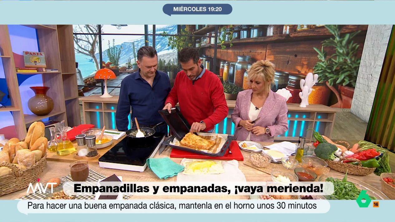 Por último, se pincela con huevo batido y se mete al horno. Ojeda indica que debe hornearse durante 30 minutos a 200 grados. Los presentadores dan buena cuenta de la empanada. "Fijaros qué cosa más sencilla y hemos tardado cuatro minutos", concluye el nutricionista.