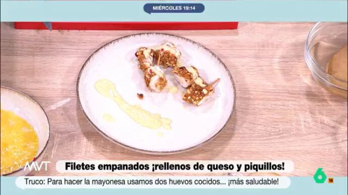 Después de enrollar los filetes de pollo y cerrarlo con unos palillos, Ojeda lo pasa por el huevo batido y después por quicos triturados, que no pan rallado, por lo que no pone sal. Además lo acompaña de una mayonesa que prepara con huevo cocido para soportar las altas temperaturas de la fiambrera sin problema. "Está mejor de lo que esperaba", comenta al probarlo.