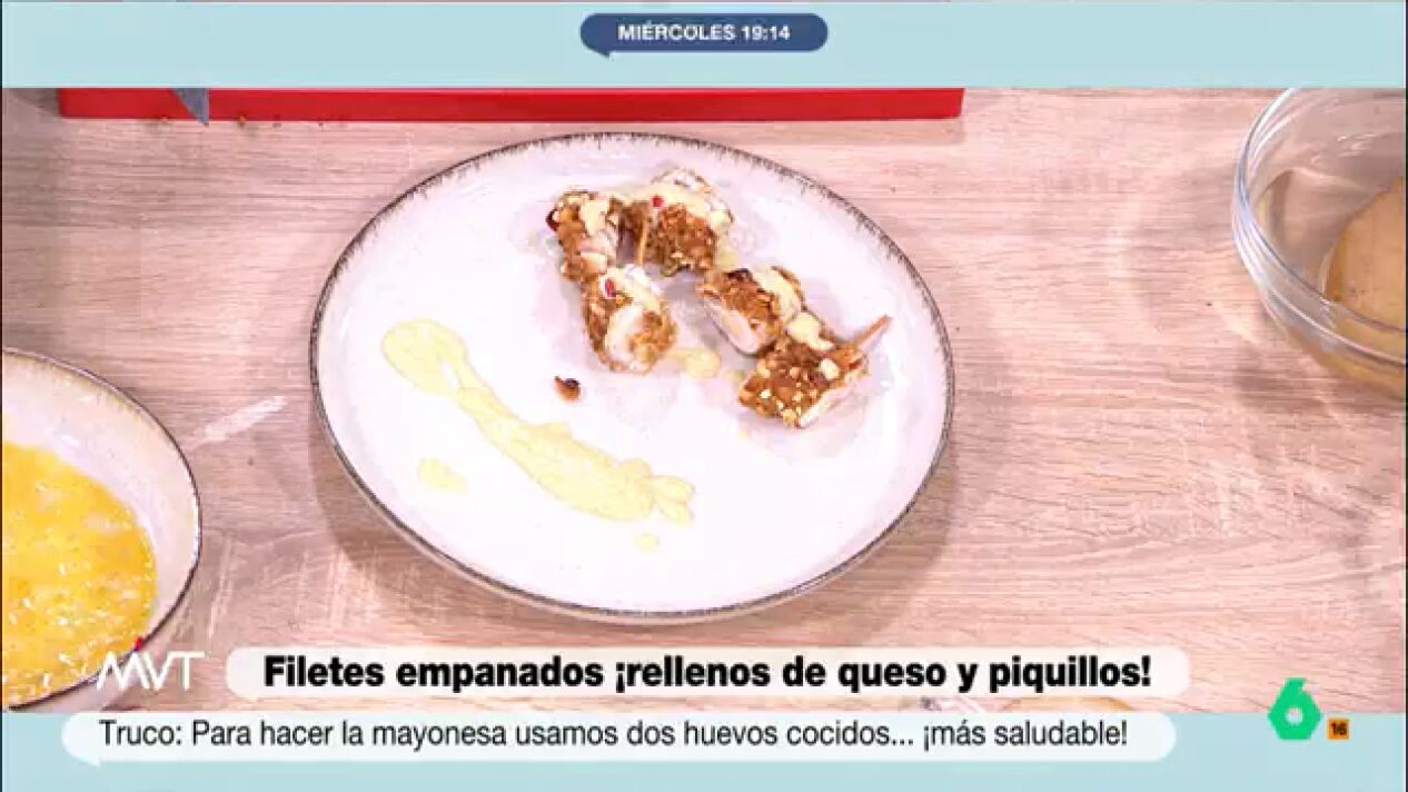 Sin embargo, el nutricionista lo prepara en el vídeo sobre estas líneas de una manera un poco diferente, con un relleno de queso, champiñones y piquillos. "Es una revisión del cachopo", apunta María Lamela.
