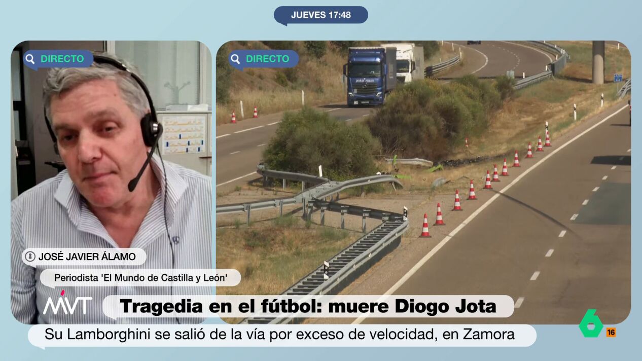 El periodista de 'El Mundo de Castilla y León' José Javier Álamo, ha detallado este jueves en Más Vale Tarde el accidente mortal de Diogo Jota y su hermano André Silva al haber sido el primer medio en conseguir y difundir el vídeo del vehículo en llamas. Entre otras cuestiones ha relatado que "la fatalidad" reside en el "exceso de velocidad y esa mala fortuna de que revienta una de las ruedas".