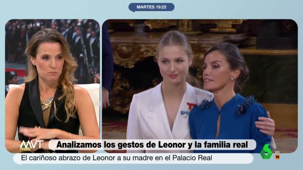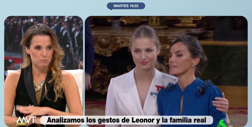 El semblante más bien serio de la reina Letizia ha sido uno de los detalles más comentados de la jura de la Constitución de Leonor. La experta en comunicación no verbal Patrycia Centeno lo analiza en Más Vale Tarde, donde señala que "podemos especular muchísimo sobre qué le pasaba a Letizia" e interpreta el gesto de la princesa al rodear los hombros de su madre con el brazo: "Cuando intentas calmar a la otra persona y decirle 'todo ha acabado, todo ha salido bien, está bien, mamá, tranquilízate, calma'".
